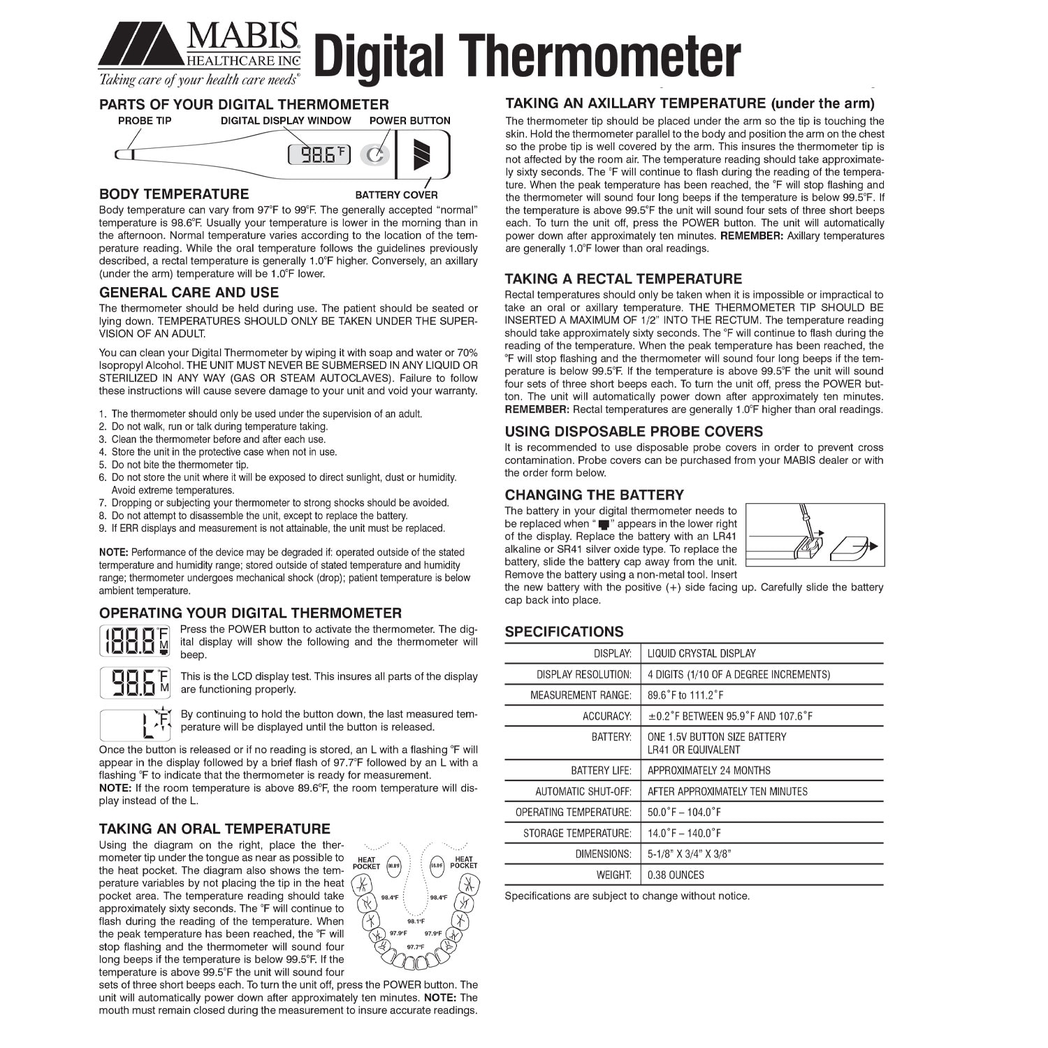 MABIS® 60-Second Clinically Accurate Digital Thermometer SKU: 15-691-000 Pinit $6.15 Quantity discounts available QuantityPrice -+ Add to Cart SpecificationsProvides quick, accurate readings for oral, rectal or underarm use for babies, children and adults. Fast 60-second readings. A convenient tone indicates peak temperature. A special fever alarm alerts you to temperatures above 99.5 degrees. Large digital display makes the readings easily visible. The thermometer is lab tested for accuracy up to 2/10th of a degree Fahrenheit. This compact thermometer is lightweight and easy to use and store. Memory recall and auto shutoff Includes 5 probe covers, convenient clear storage case and long life LR41 battery 5 1/8 x ¾ x 3/8 inches 1-year Limited warrantyUPC: 767056156913