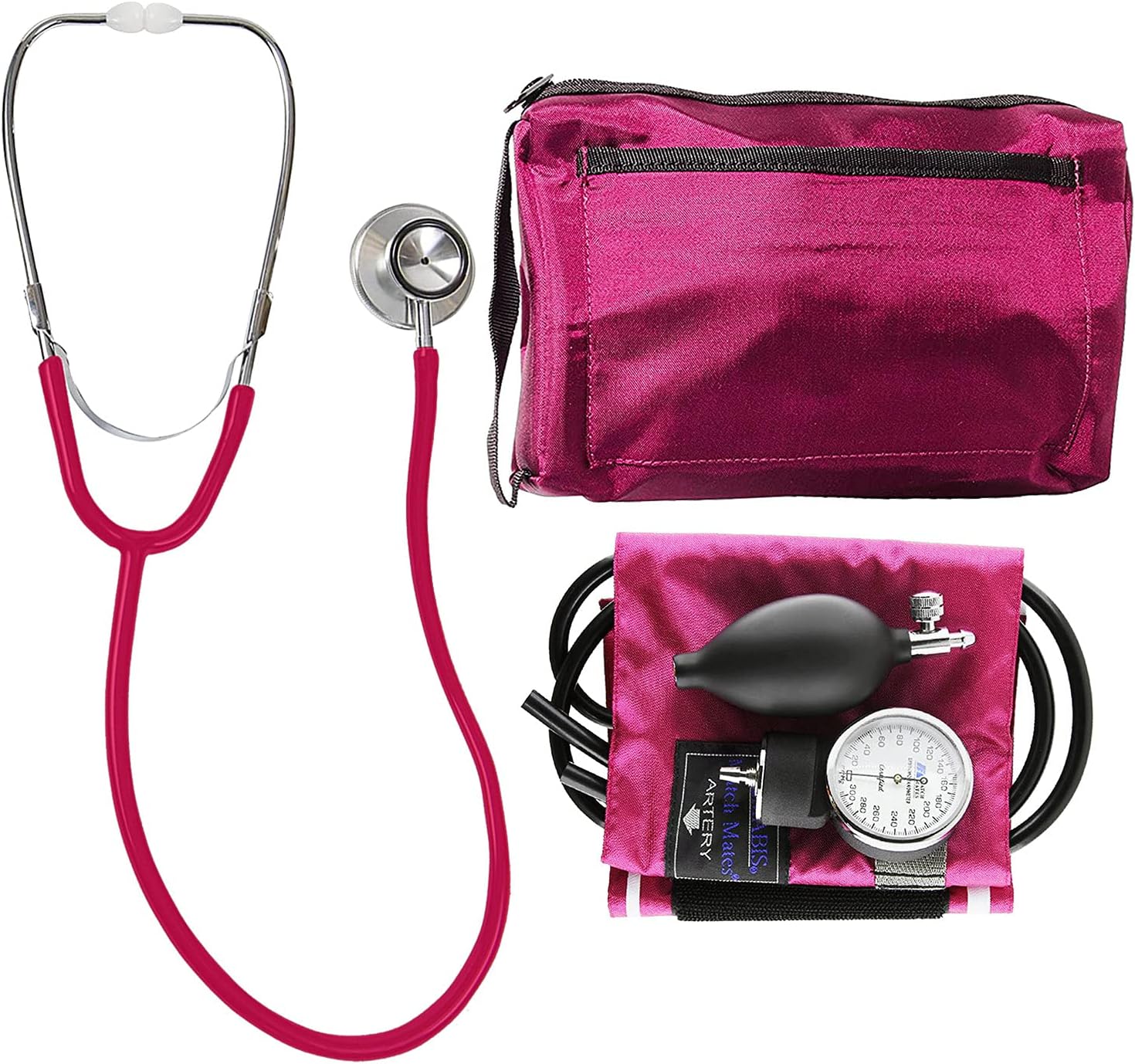 MABIS Blood Pressure Cuff and Dual Head Stethoscope Kit SKU: MatchMates Dual Head Combination Kit Pinit Style : Black Magenta $28.13 to $58.50 Quantity discounts available QuantityPrice -+ Add to Cart SpecificationsLifetime warranty included on all MABIS manual blood pressure cuffs with stethoscopes.Superior design. Calibrated nylon cuff fits comfortably on your arm. The aneroid gauge shows easy-to-read numbers, perfect for those with poor vision. The bp cuff and stethoscope kit comes with comfortable mushroom ear tips that complement its effective design.Convenient matching nylon carrying case ensures you will always have this handy blood pressure kit ready to go.Ideal for doctors, nurses, EMTs, other medical professionals and students!Lifetime calibration warranty. Contains latex
