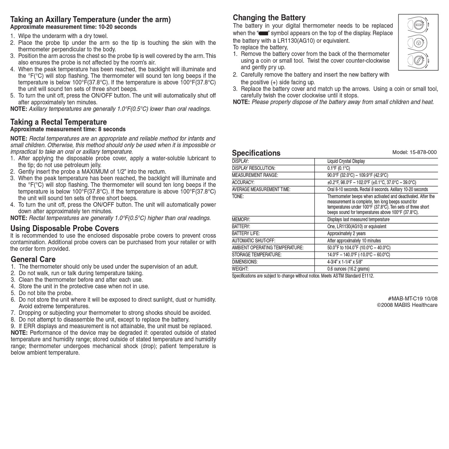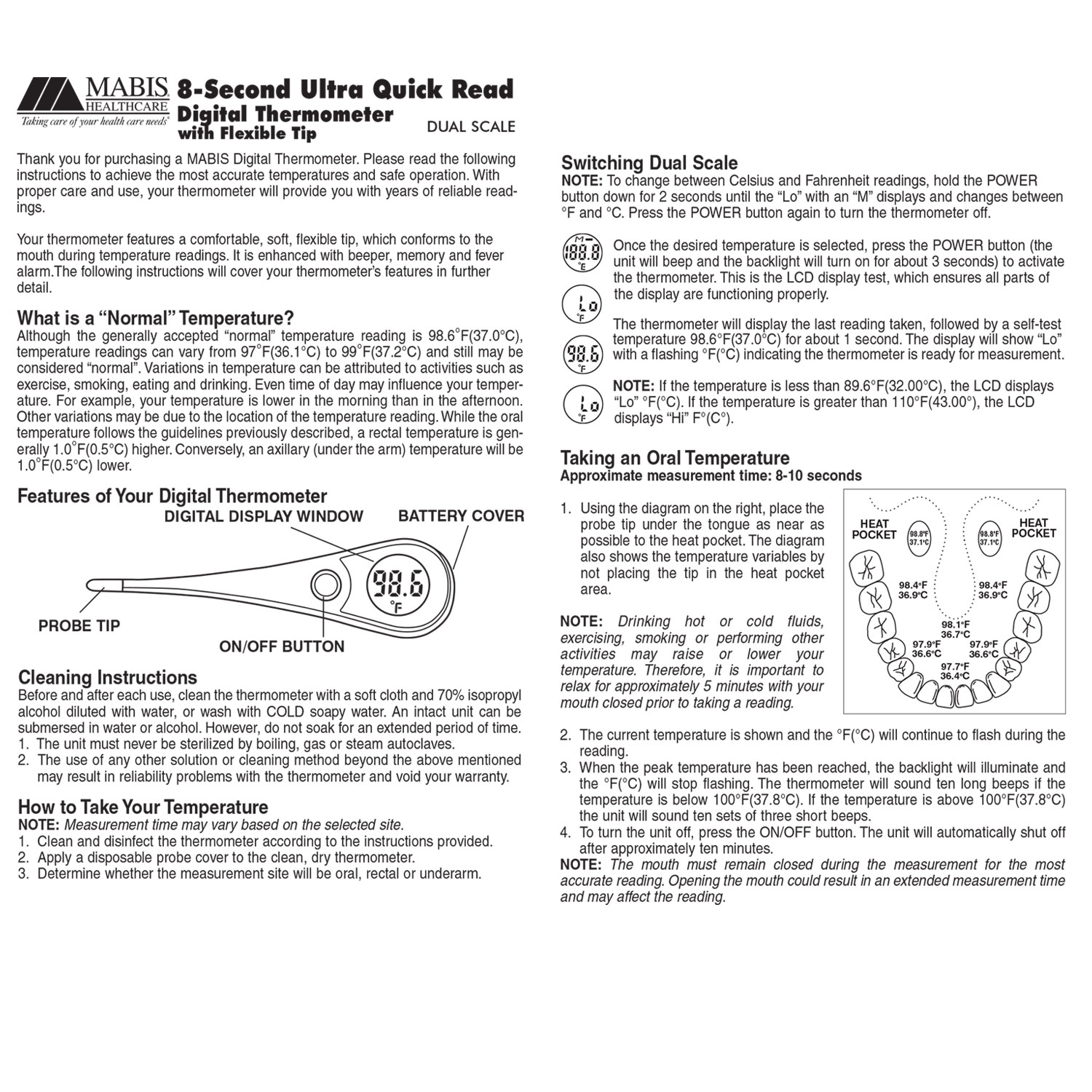 MABIS® Glow-in-the-Dark 8-Second Digital Thermometer SKU: 15-878-000 Pinit $12.20 Quantity discounts available QuantityPrice -+ Add to Cart SpecificationsUltra-fast readings -- 8 second rectal, 8 to 20 second oral and 10 to 20 second underarm Flexible comfort tip conforms to the mouth and stays in place Large easy-to-read display with Nite Glo; a backlit digital display that glows soft green for easy readings in the dark Accuracy to 2/10ths of a degree; reads in both Fahrenheit and Celsius Waterproof – completely submersible for easy cleaning Tone signal indicates peak temperature; fever alarm alerts you to temperatures above 99.5 F or 37.5 C Memory recalls the least reading Large easy-to-read display Includes 5 probe covers and convenient storage case Auto shut off Mercury free: no danger of mercury spillage for poisoning Long-life LR1130 battery Lifetime limited warranty Detailed instructions in English and Spanish Measures 1 1/2 x 4 ½ inches UPC: 767056158788