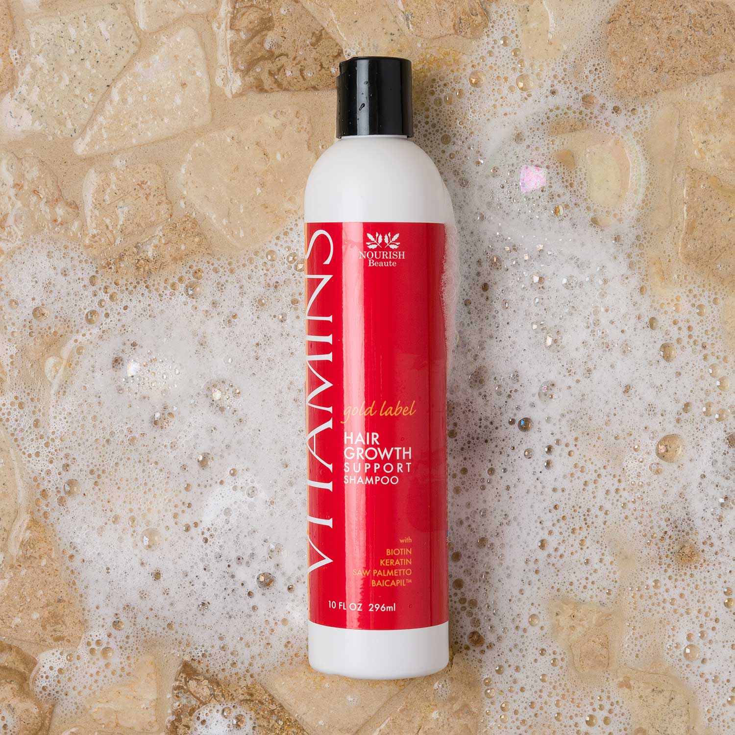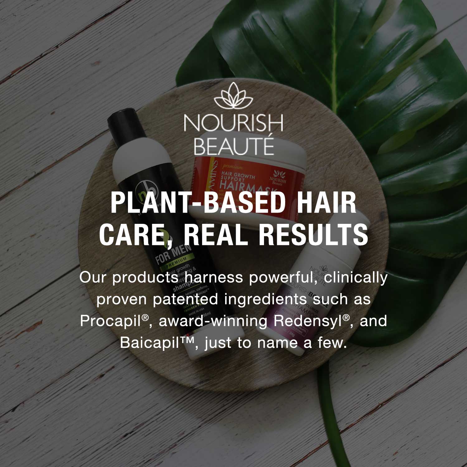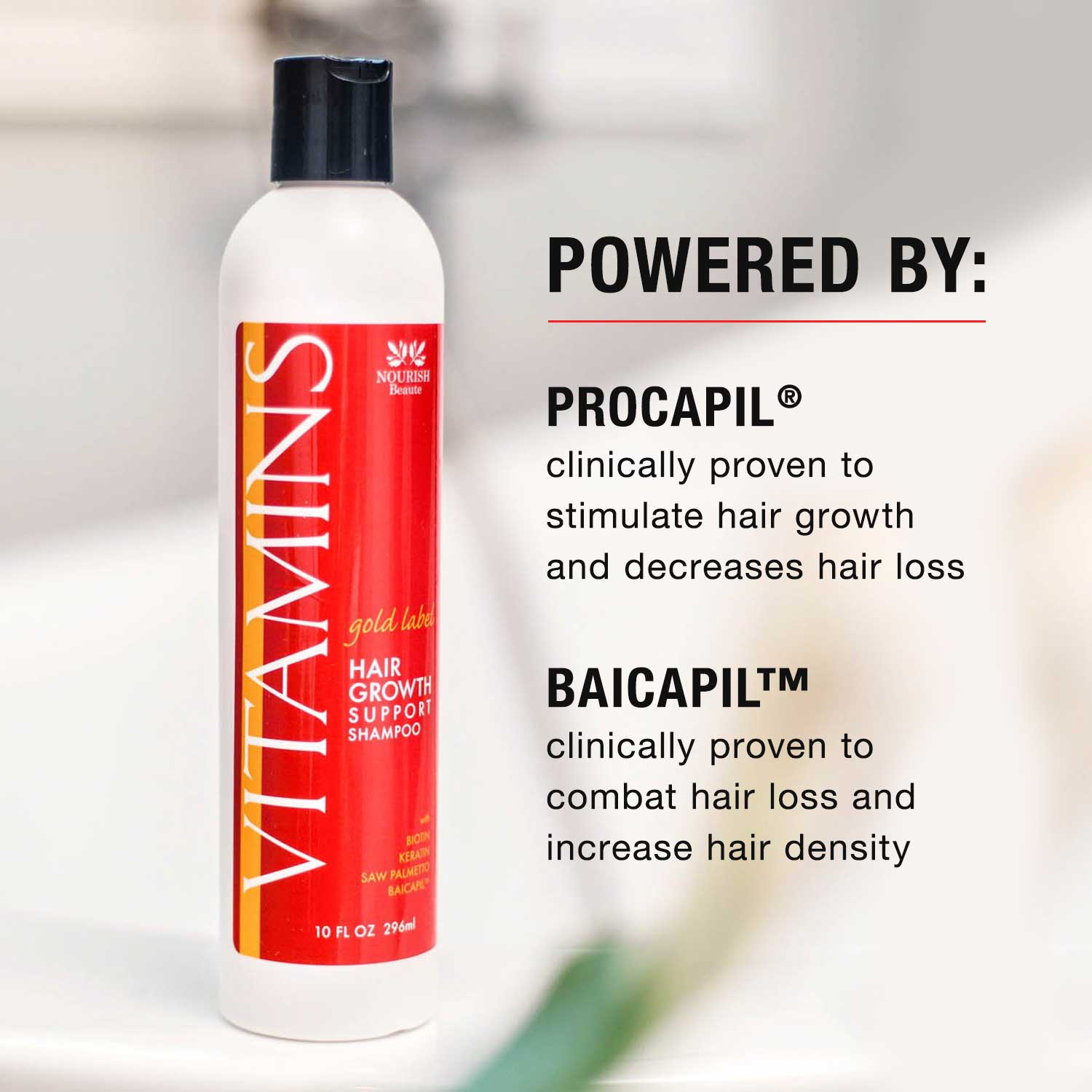 Nourish Beaute Premium Hair Growth Support Shampoo SKU: 200-1150-0001 Pinit $18.20 Quantity discounts available QuantityPrice In StockAvailable: 361 -+ Add to Cart SpecificationsPROMOTE NATURAL HAIR GROWTH with a non Sulfate DHT blocker formula to naturally help fight thinning hair due to hormonal imbalance, male pattern balding, receding hairline, postpartum, thyroid symptoms, and scalp conditions with patented Procapil, Baicapil, Biotin and Keratin. Botanicals, antioxidants & vitamins help clean the scalp and strengthen the follicle to create the optimal environment for hair regrowthHAIR GROWTH PREMIUM SHAMPOO has patented ingredients to rid the scalp of DHT, improve circulation, stop buildup, stimulate the growth phase and strengthen follicles for less shedding. Procapil, helps stop the hair follicle from ageing. Baicapil acts to visibly combat hair loss, stimulate hair growth and increase hair densityFIND NATURAL SHINE AND REGROWTH WITH CASTOR AND COCONUT OIL to add volume and moisture. This blend of ingredients provides the vitamins, essential fatty acids, and oils to help nourish the scalp at the follicle level and through-out the entire length of hair for a thicker, fuller look and feel. Keeps hair looking full, smooth and shinySHAMPOO MADE IN THE USA means it is manufactured under stringent practices and doesn't contain sulfates, parabens, hormones, alcohol, gluten, yeast, dairy and does not involve experimentation on animalsHAPPINESS GUARANTEE! It can take up to 60-90 days for hair to go through its normal cycle before seeing results. To help educate and facilitate the regrowth process, a hair growth guide is included with each purchase